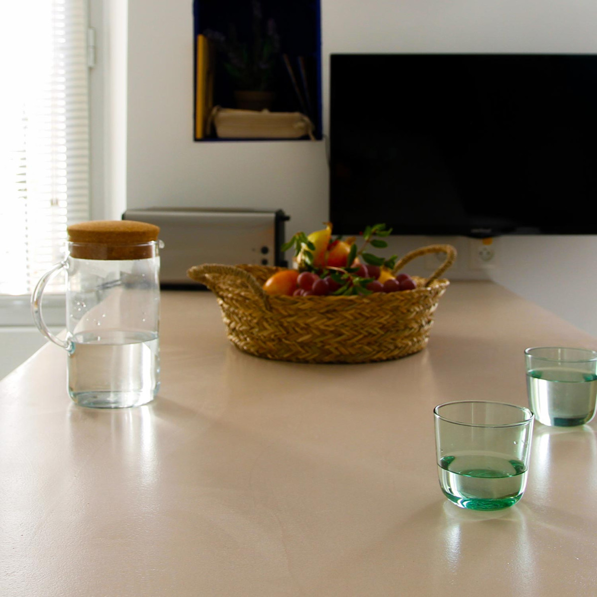 Le aconsejamos incorporar eventualmente a nuestro imprimador una tela de vidrio tarlatana en el encuentro entre la pared y el salpicadero si este está realizado en microcemento y después una junta para un acabado más cuidado. Esta tela de vidrio permitirá disminuir el riesgo de fisuración entre la encimera y el salpicadero.