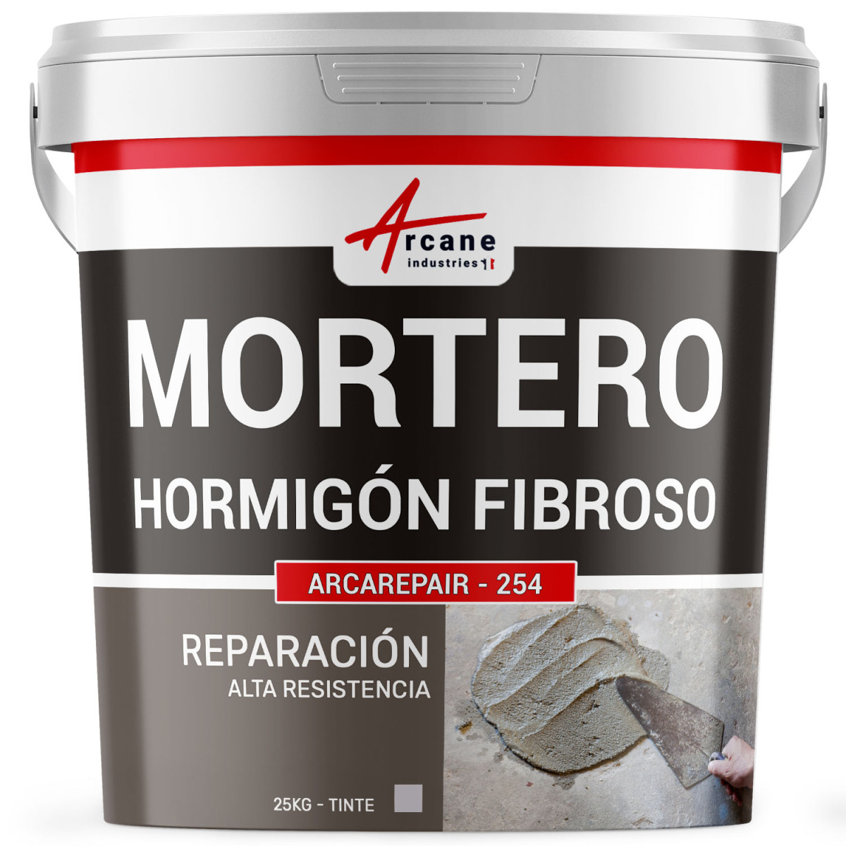 Mortero de reparación fibrado con retracción compensada para reparación de hormigón armado deteriorado.