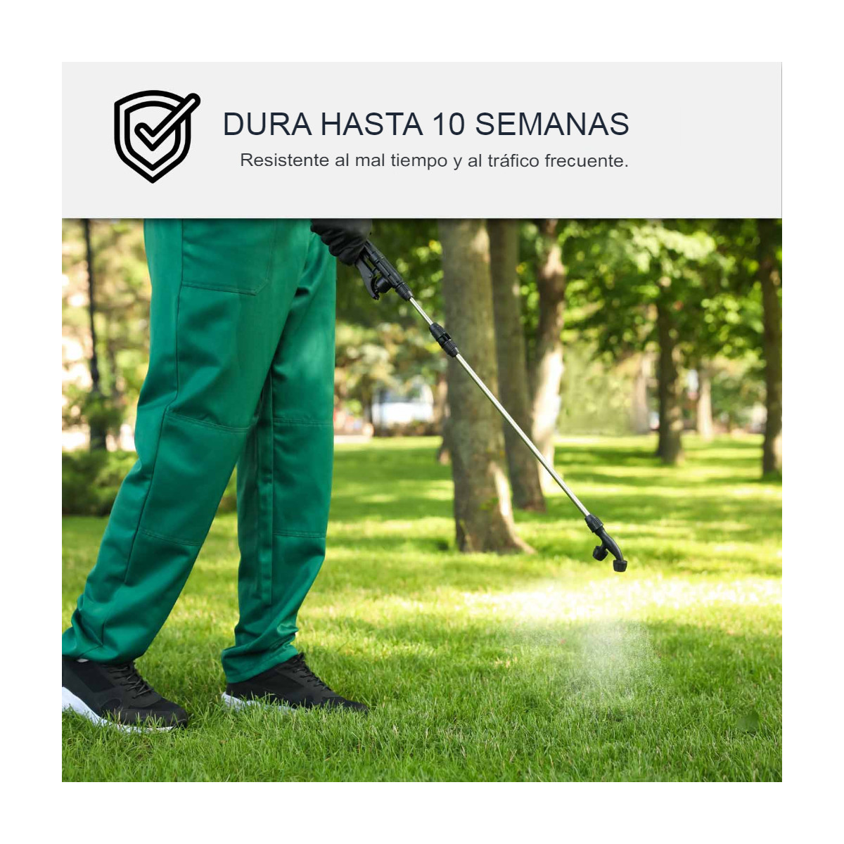 - Durabilidad: Dura hasta 10 semanas, resistente a las inclemencias del tiempo como la lluvia y el paso frecuente.