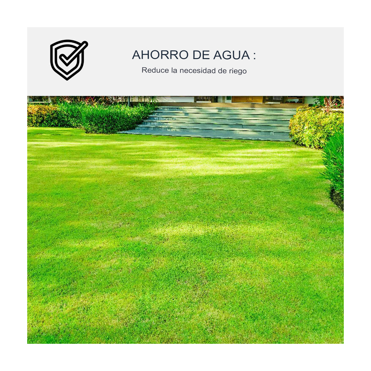- Ahorro de agua: Reduce la necesidad de riego gracias a su fórmula única que mantiene el verdor sin la humedad constante.