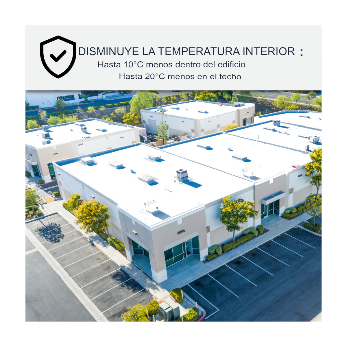 * A tener en cuenta que si un aislamiento ya está presente (ejemplo panel de aislamiento) la eficacia será reducida en el edificio sin embargo la protección y la disminución de la temperatura sobre el tejado serán igualmente eficaces.