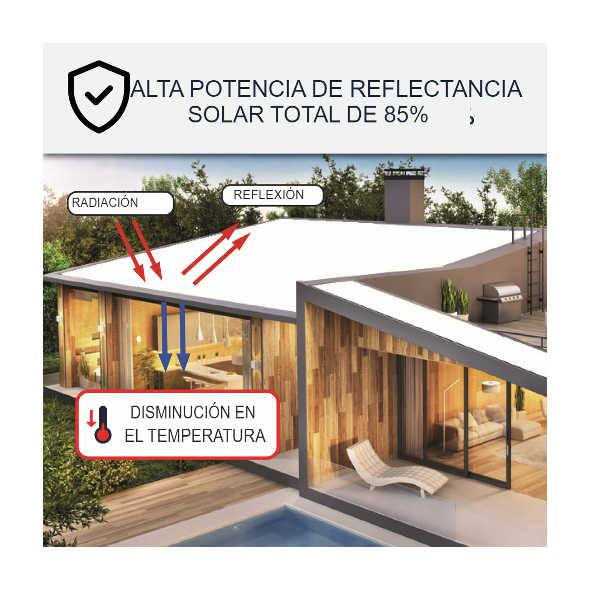 - Una alta tasa de reflectancia solar total del 85%
