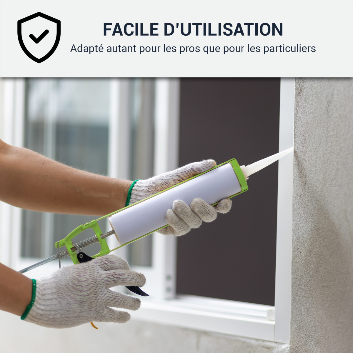 Nuestra pistola de masilla profesional también es fácil de limpiar y mantener, con una construcción robusta que la hace duradera y fiable en todas las condiciones de trabajo.