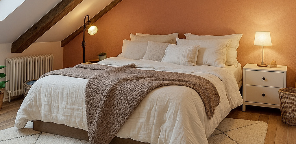 Chambre mansardée avec un mur peint en Roussette Rose Cuivre ARGILIS : une teinte chaleureuse qui sublime un intérieur cosy et naturel.