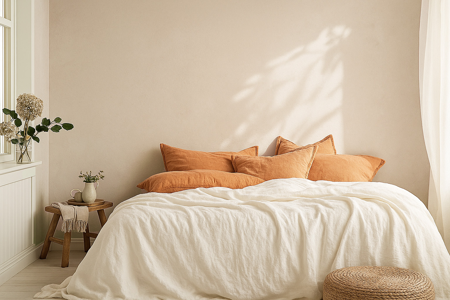 Dans la chambre, créez un véritable cocon en peignant le mur derrière la tête de lit en rose poudré, une teinte douce et enveloppante qui favorise la détente. Associez-la à du linge de lit en lin blanc cassé, des coussins aux tons neutres, un plaid en laine naturelle et des rideaux en lin lavé pour accentuer le côté chaleureux et authentique de la pièce. Pour plus d’idées, découvrez notre article dédié à la Peinture chambre grise ou celui à la peinture chambre rose.