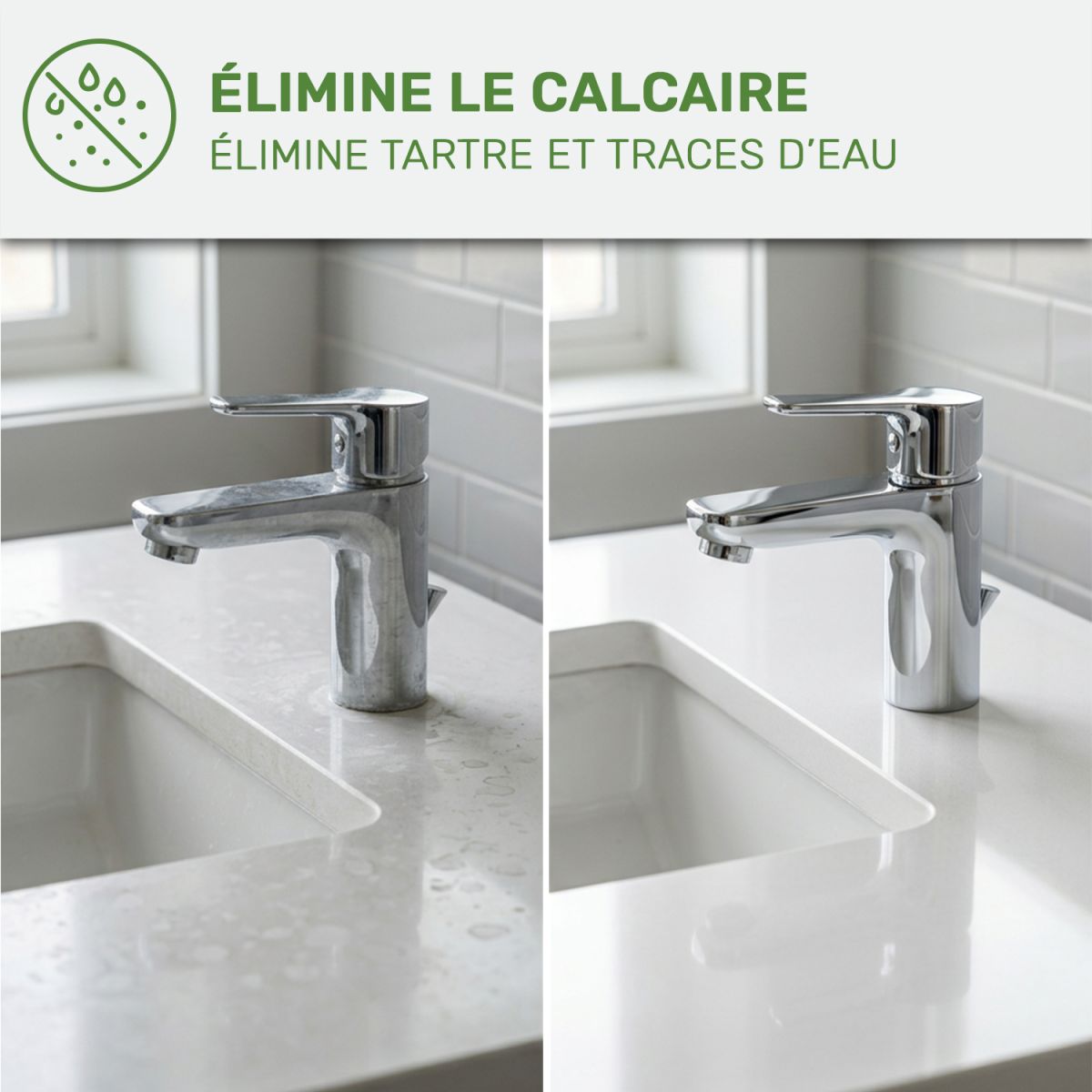 - Pulvériser directement sur la surface à traiter (lavabo, douche, robinetterie, etc.).