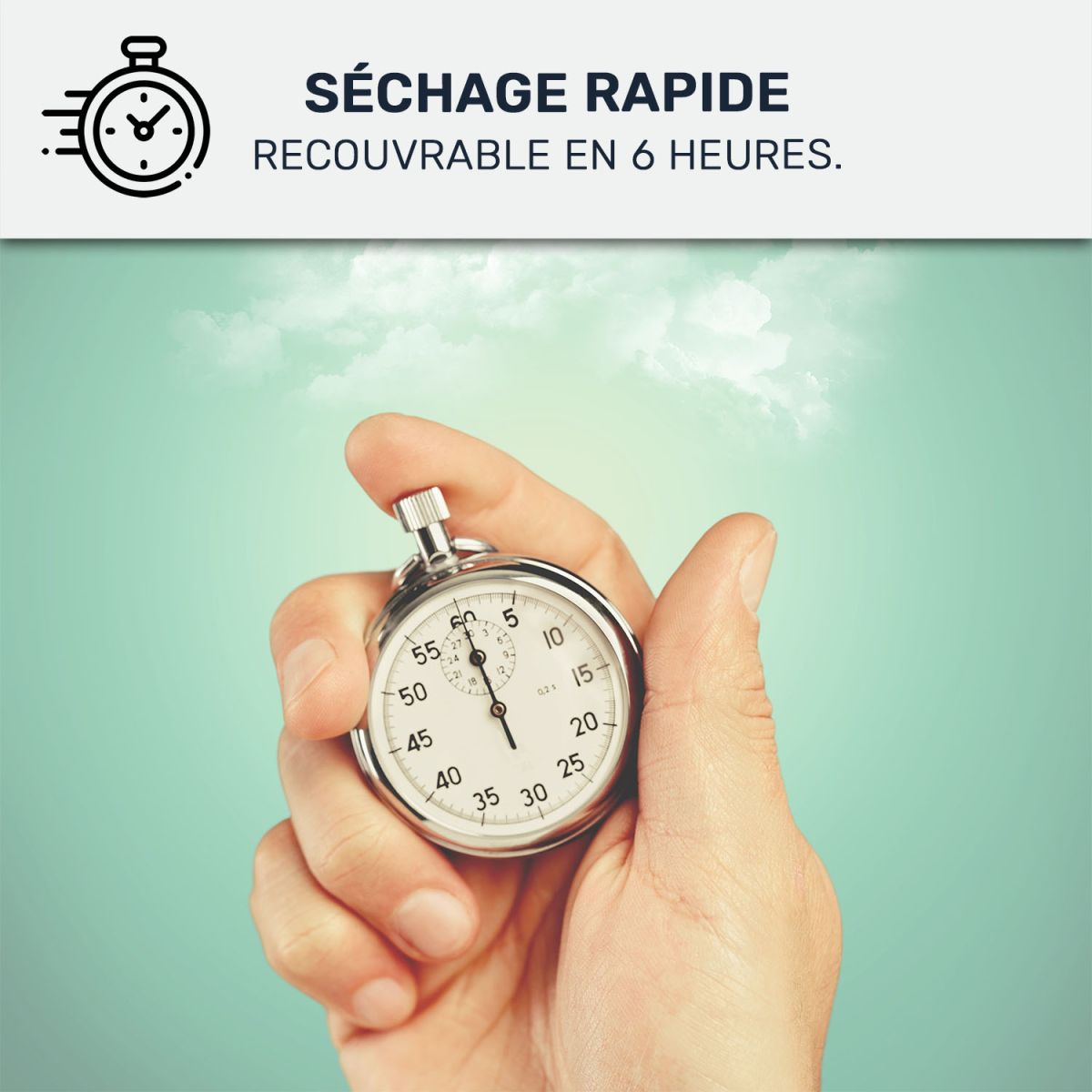 Temps de séchage indicatif à 20°C et 50% HR. Variable selon les conditions d’application.