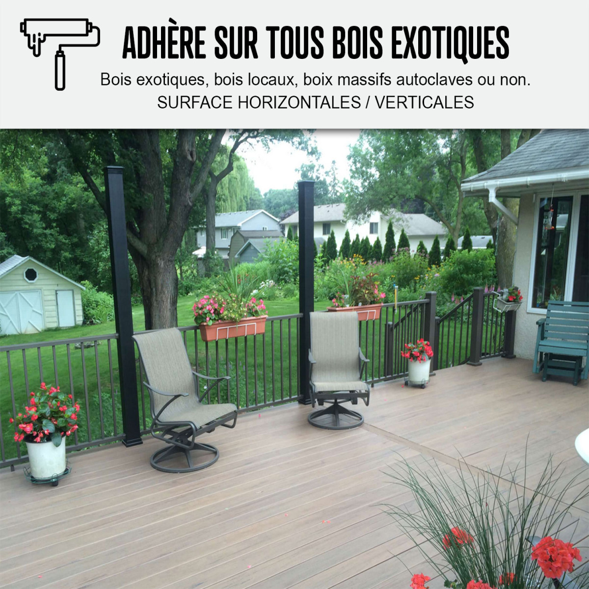 Un bois exotique extérieur non protégé et non entretenu régulièrement se détériorera rapidement. Il est donc indispensable de le protéger, notamment pour les terrasses bois, bardages et mobilier de jardin, avec un saturateur bois exotique de haute qualité. Ce protecteur pénètre à l'intérieur pour une action durable.