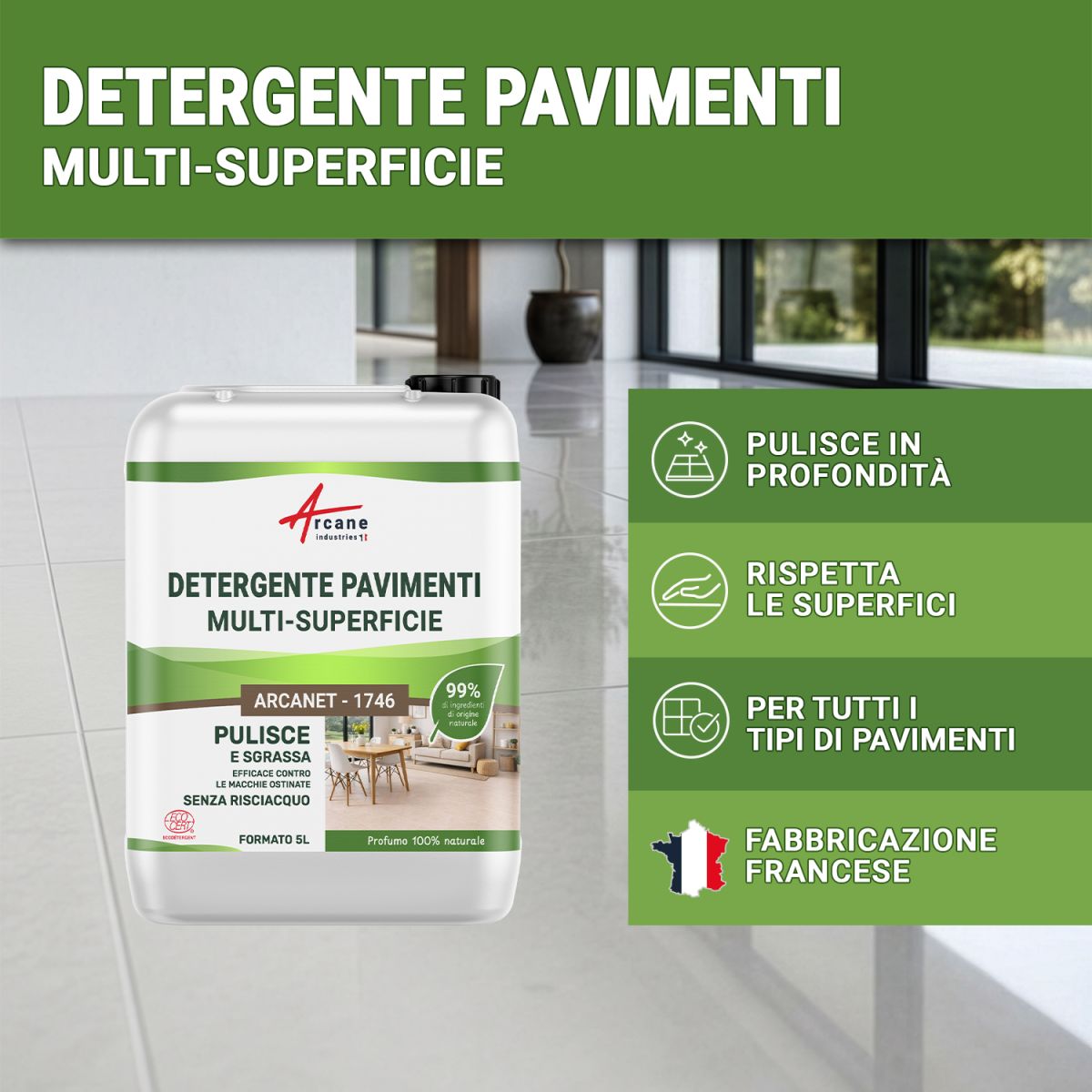Arcanet - 1746 è un prodotto detergente professionale per pavimenti formulato per soddisfare le esigenze della pulizia quotidiana o intensiva su tutti i tipi di pavimenti. Certificato Écocert Greenlife e composto al 99% da ingredienti di origine naturale, questo detergente per pavimenti concentrato multiuso combina efficacia sgrassante, sicurezza d'uso e rispetto dell'ambiente. Si adatta a tutti i processi di pulizia manuale o meccanizzata, in ambienti domestici o professionali.