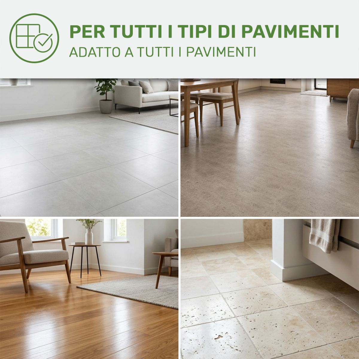 - Polivalente: adatto a tutti i tipi di pavimenti (escluse le superfici vetrate), anche fragili*.