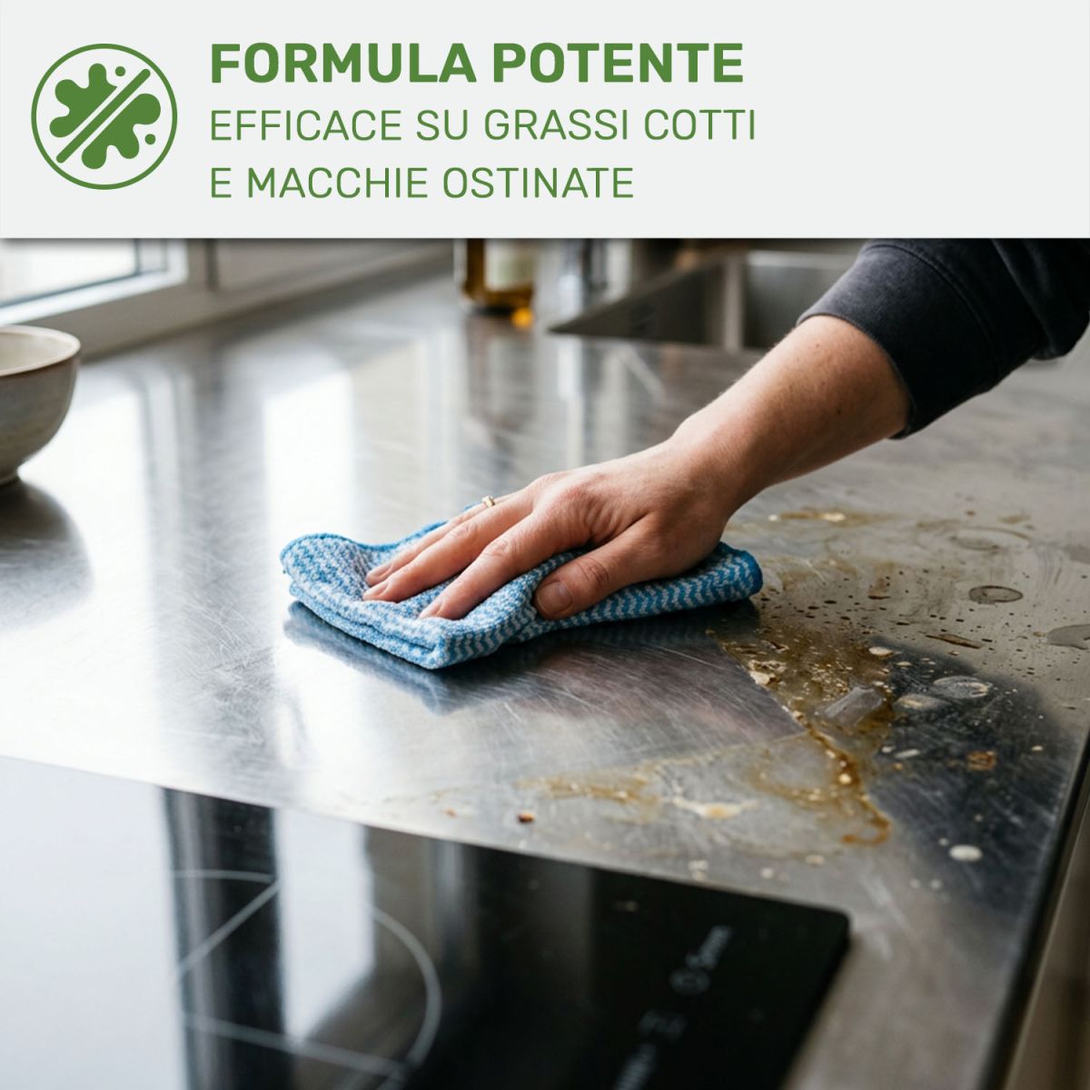 - Formula potente: detergente alcalino progettato per eliminare efficacemente i grassi crudi, cotti o carbonizzati, anche sulle superfici più incrostate.