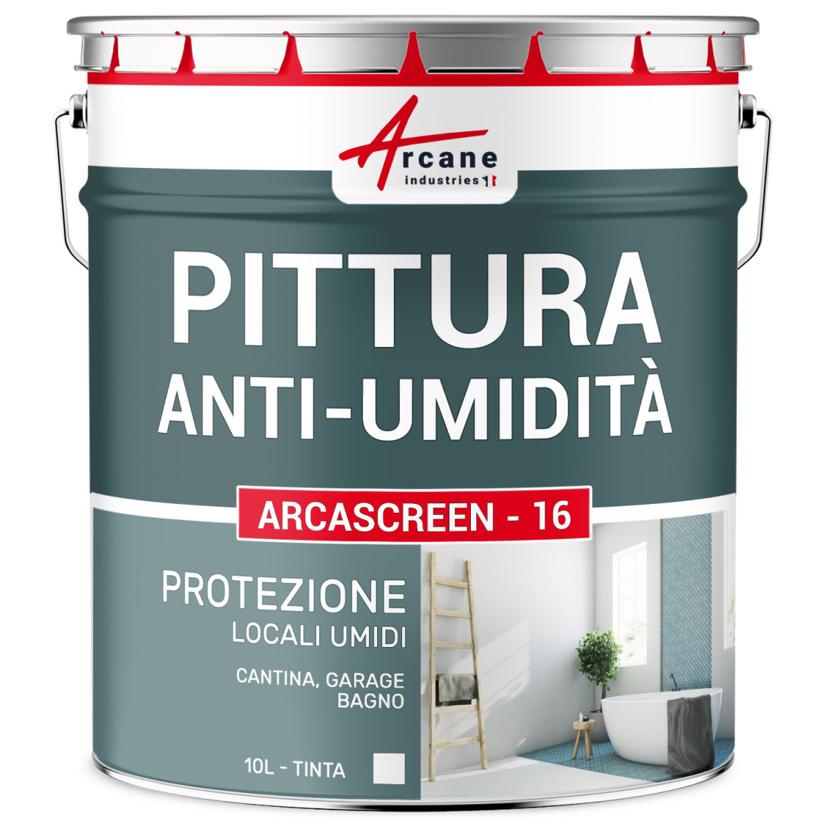 ARCASCREEN - 16 è una pittura antiumidità isolante a base solventata a base di cemento idrorepellente che creerà una barriera impermeabile e tratterà l'umidità negli ambienti interni come le cantine ad esempio. Blocca la circolazione dell'acqua nelle reti capillari del muro.