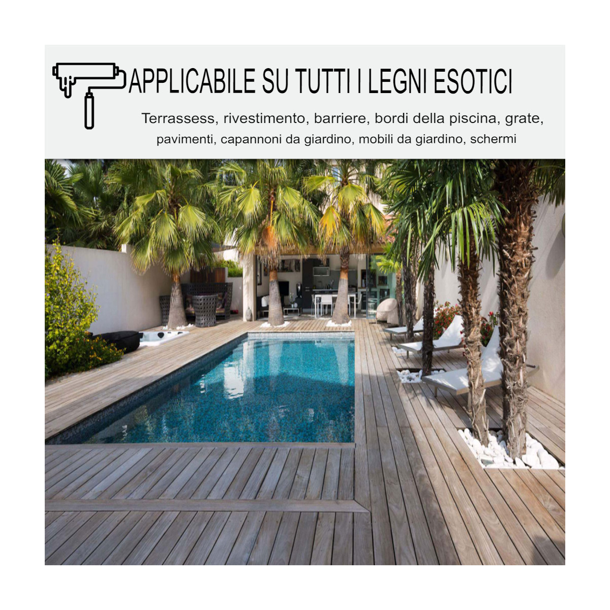 Un legno esotico esterno non protetto e non mantenuto regolarmente si deteriorerà rapidamente. È quindi indispensabile proteggerlo, in particolare per le terrazze in legno, rivestimenti e mobili da giardino, con un saturatore per legno esotico di alta qualità. Questo protettore penetra all'interno per un'azione duratura.