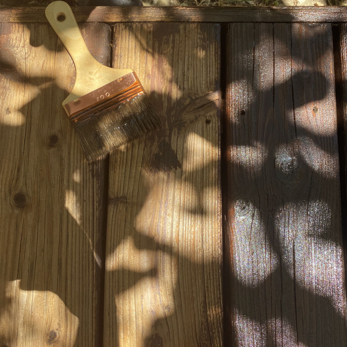 - Applicazione nel senso delle fibre del legno fino a saturazione del supporto. Non sovraccaricare, il prodotto deve impregnarsi nel legno