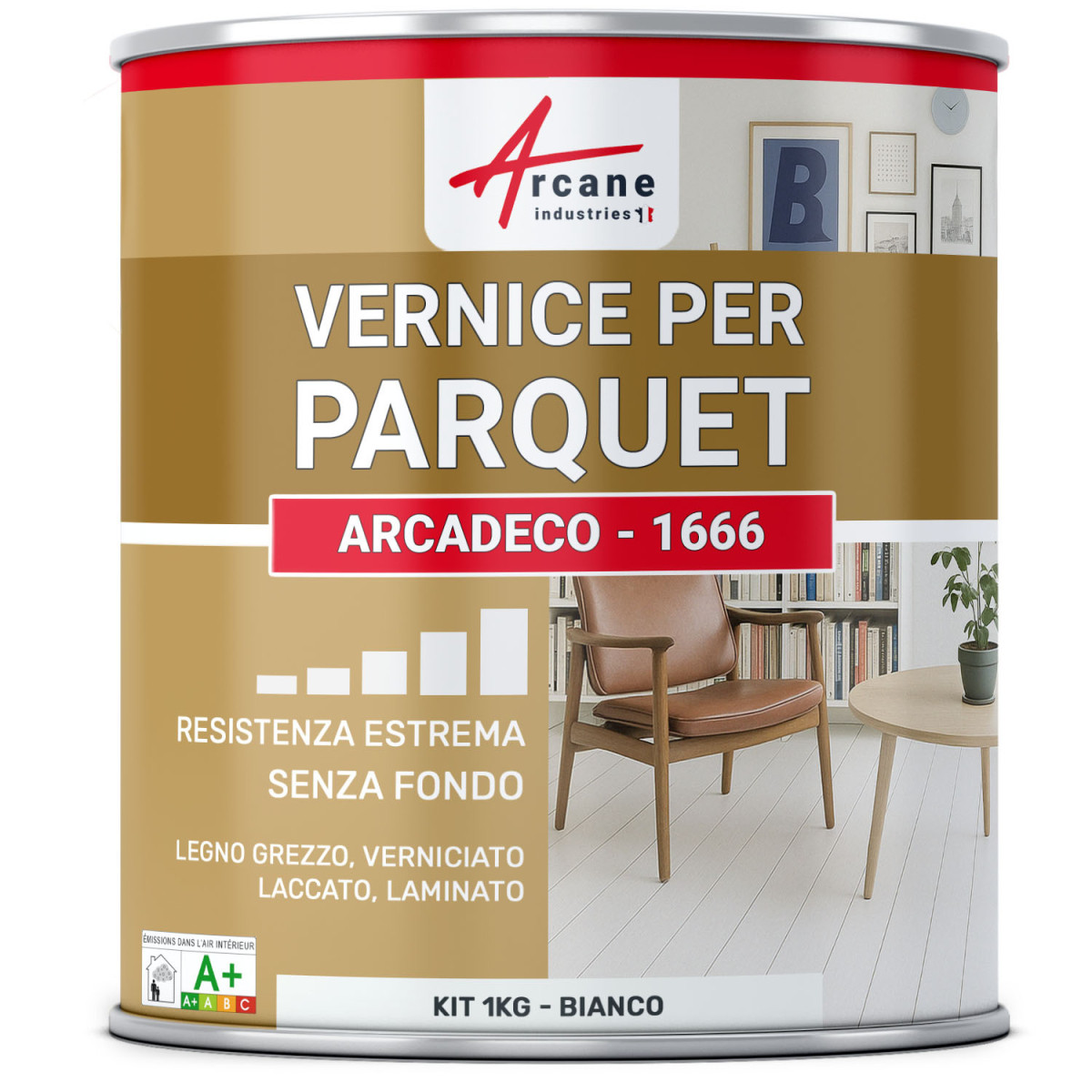 ARCADECO - 1666 è una vernice bianca ad alte prestazioni per parquet, progettata per ridare vita ai pavimenti in legno con eleganza e durabilità. La sua formula a base di resina poliuretanica in dispersione acquosa offre una resistenza rinforzata al traffico ripetuto e all'usura quotidiana.