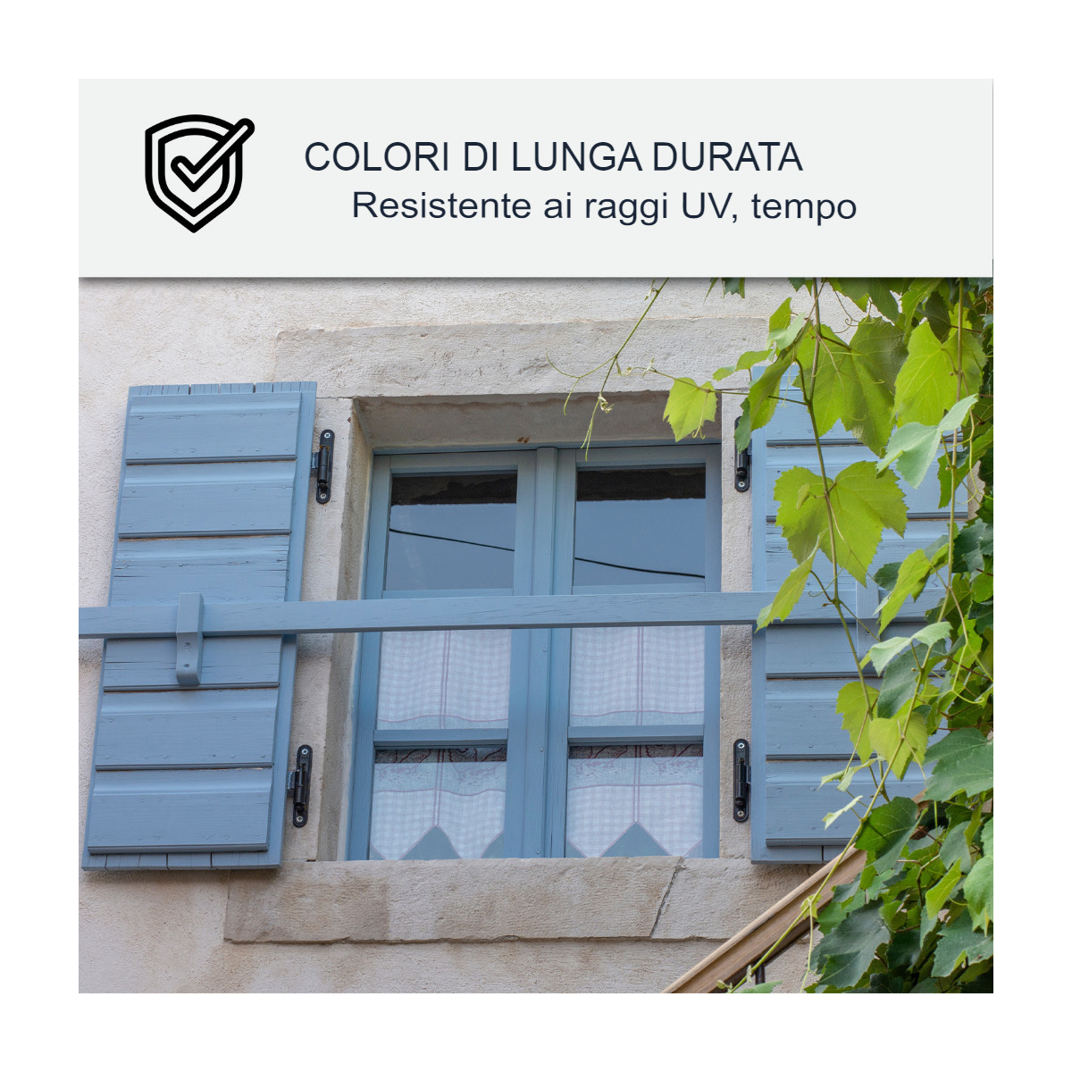 1L permette di dipingere fino a 12 m² per strato, ovvero 6 m² in 2 strati (raccomandato). Attenzione, se la persiana in legno è molto assorbente, potrebbe essere necessario aumentare questo consumo fino al 30%.