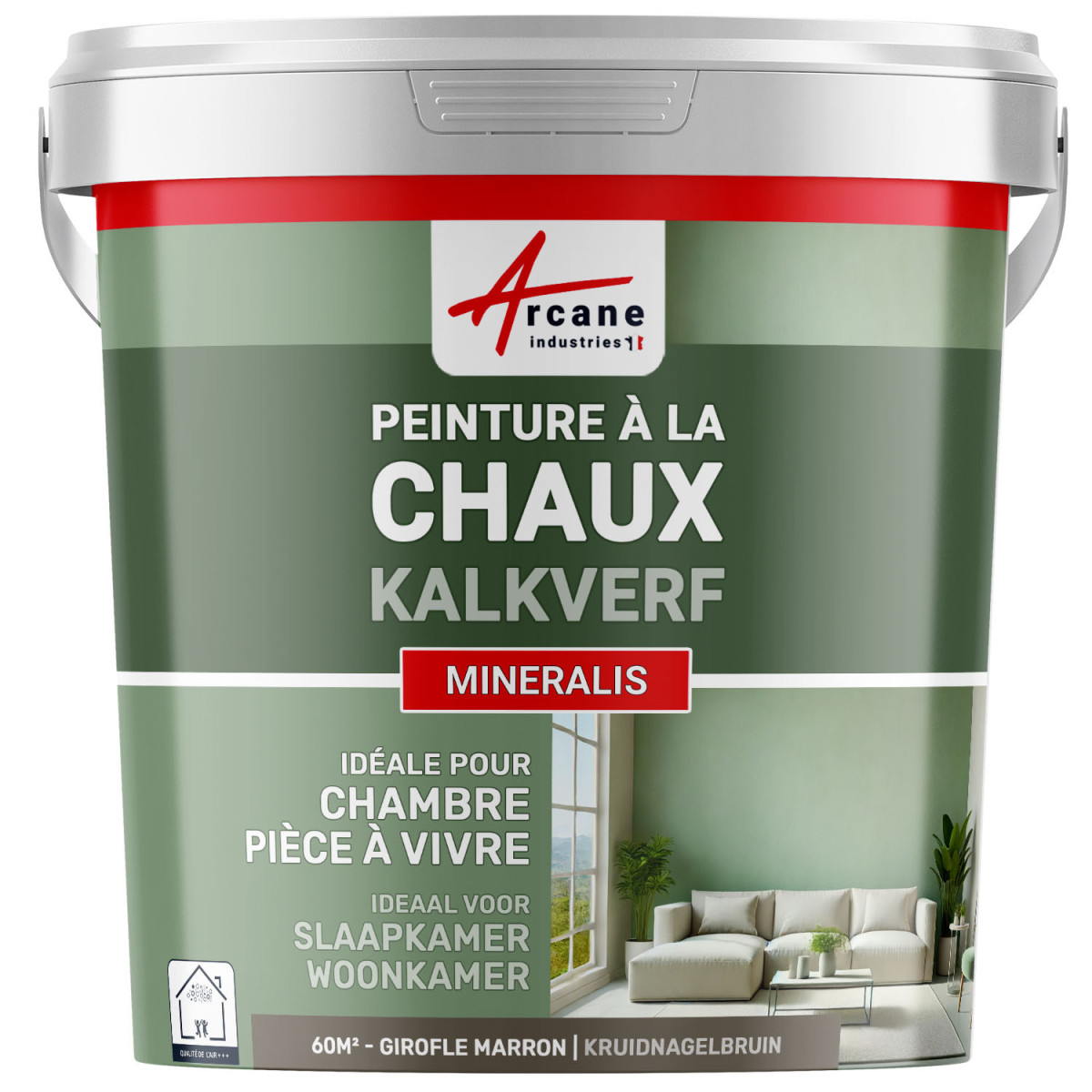 De Bruine Kalkverf voor Binnen - MINERALIS is een minerale verf op basis van luchtkalk, ontworpen om een getextureerd en diep resultaat te bieden. Dankzij de minerale pigmenten creëert het een authentieke en omhullende sfeer, perfect om de ruimte te structureren en de intimiteit van een kamer te versterken.