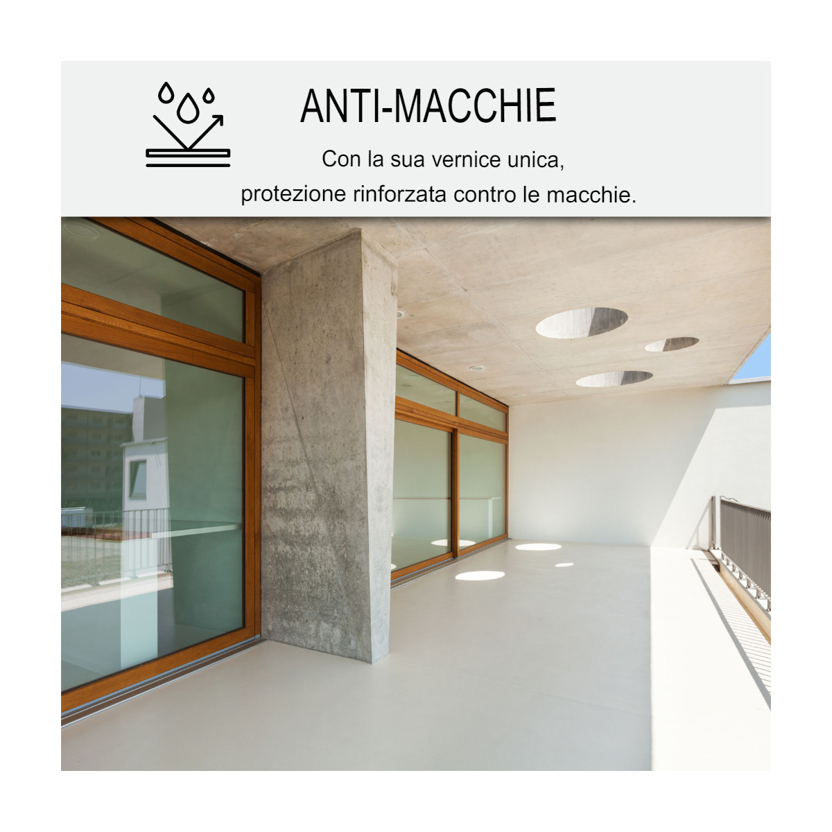 Het roze gepolijst beton wordt beschermd door het aanbrengen van een poriënvuller en een HIGHPROTECT vernis, die een hoge weerstand tegen water en vlekken garandeert.